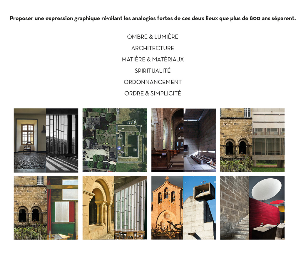Création graphique autour des deux lieux emblématiques : le couvent d’Aubazine et le couvent de la Tourette de l’architecte Le Corbusier.