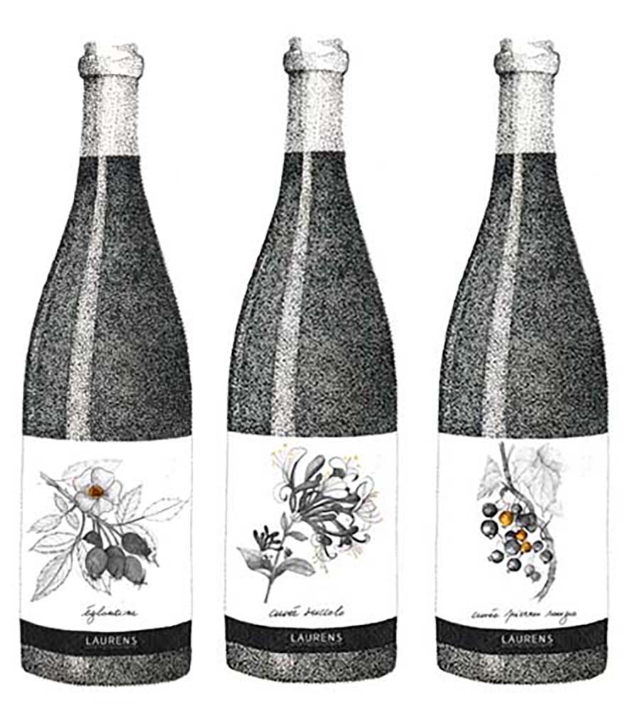 Réalisation de quatre étiquettes de vin, Domaine Laurens, vigneron, récoltant, distillateur, Marcillac, Aveyron.