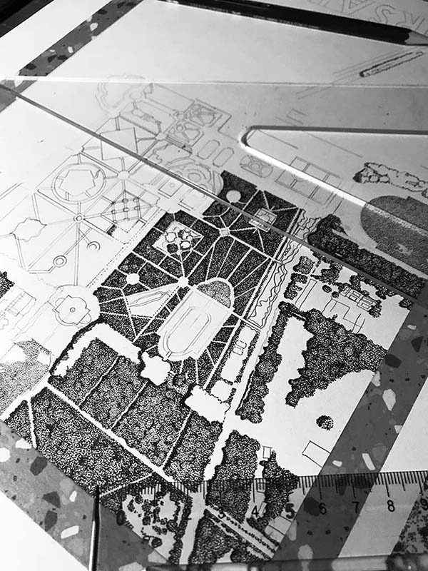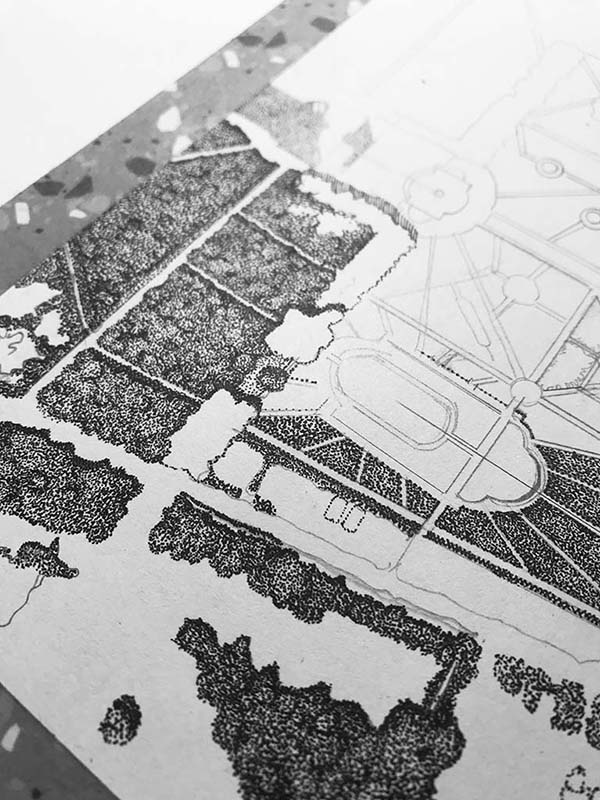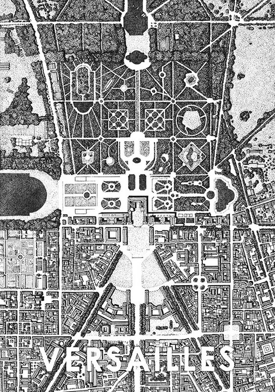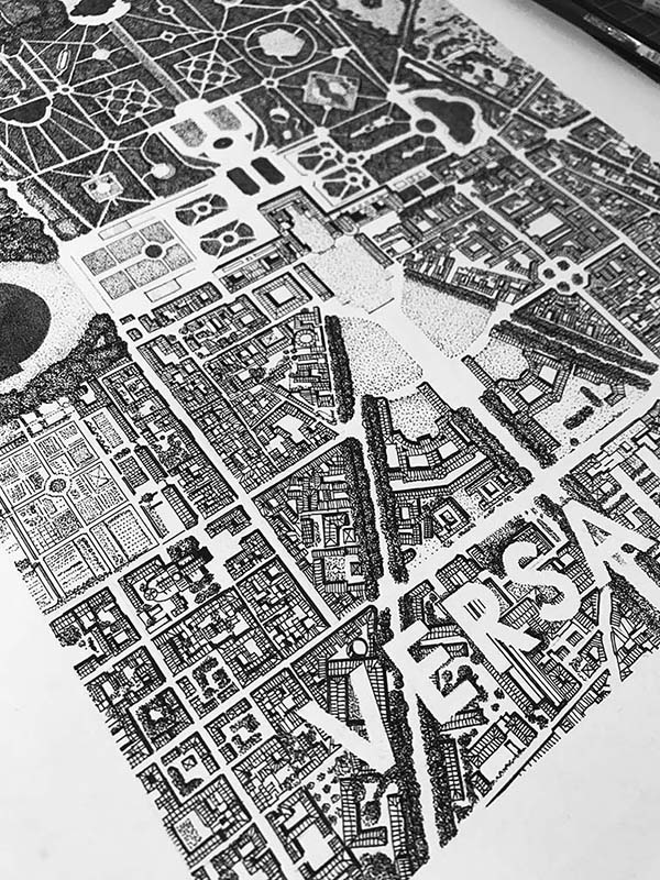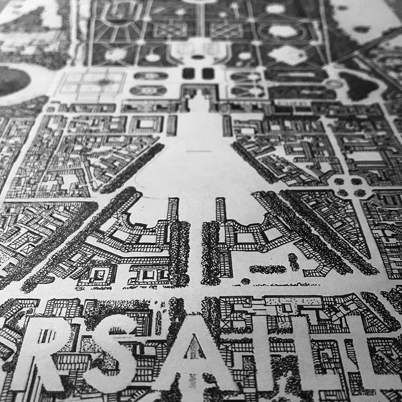Réalisation d’un plan de Versailles, Encre noire sur papier Moleskine, dimensions 30 cm x 21 cm. Commande privée.