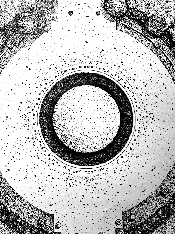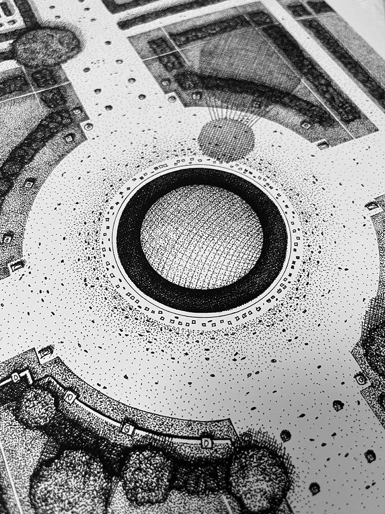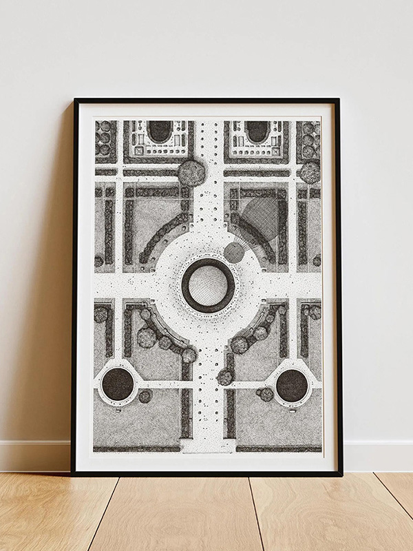 Jardin des Tuileries vue du ciel : évocation de la vasque olympique pendant les JO.